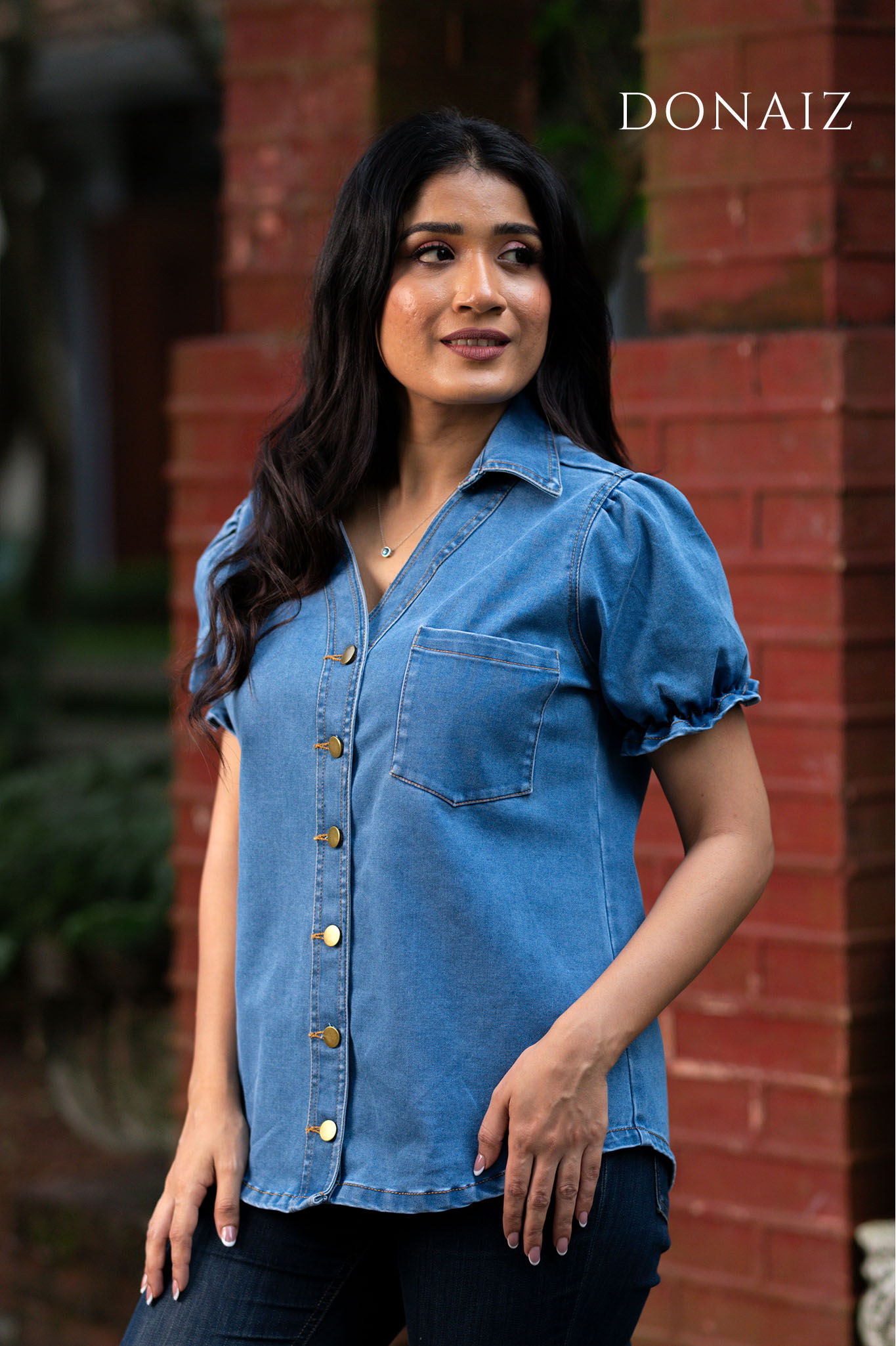 Fashionable V Neck Collared Denim Top