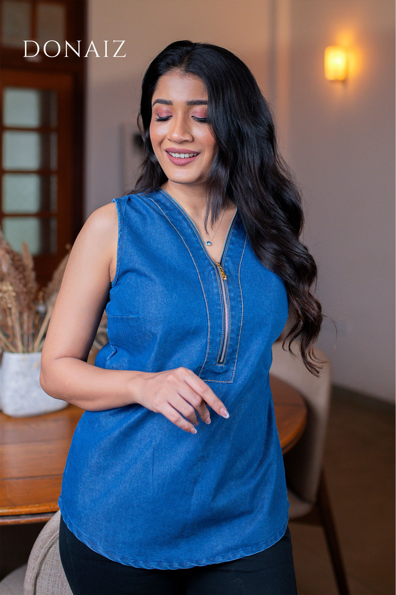 Gorgeous Sleeveless Zipper Chambray Top
